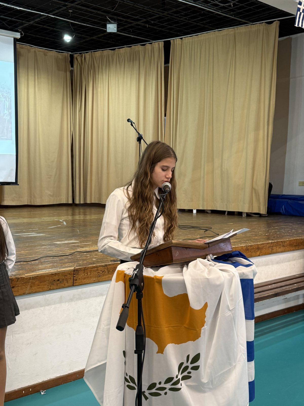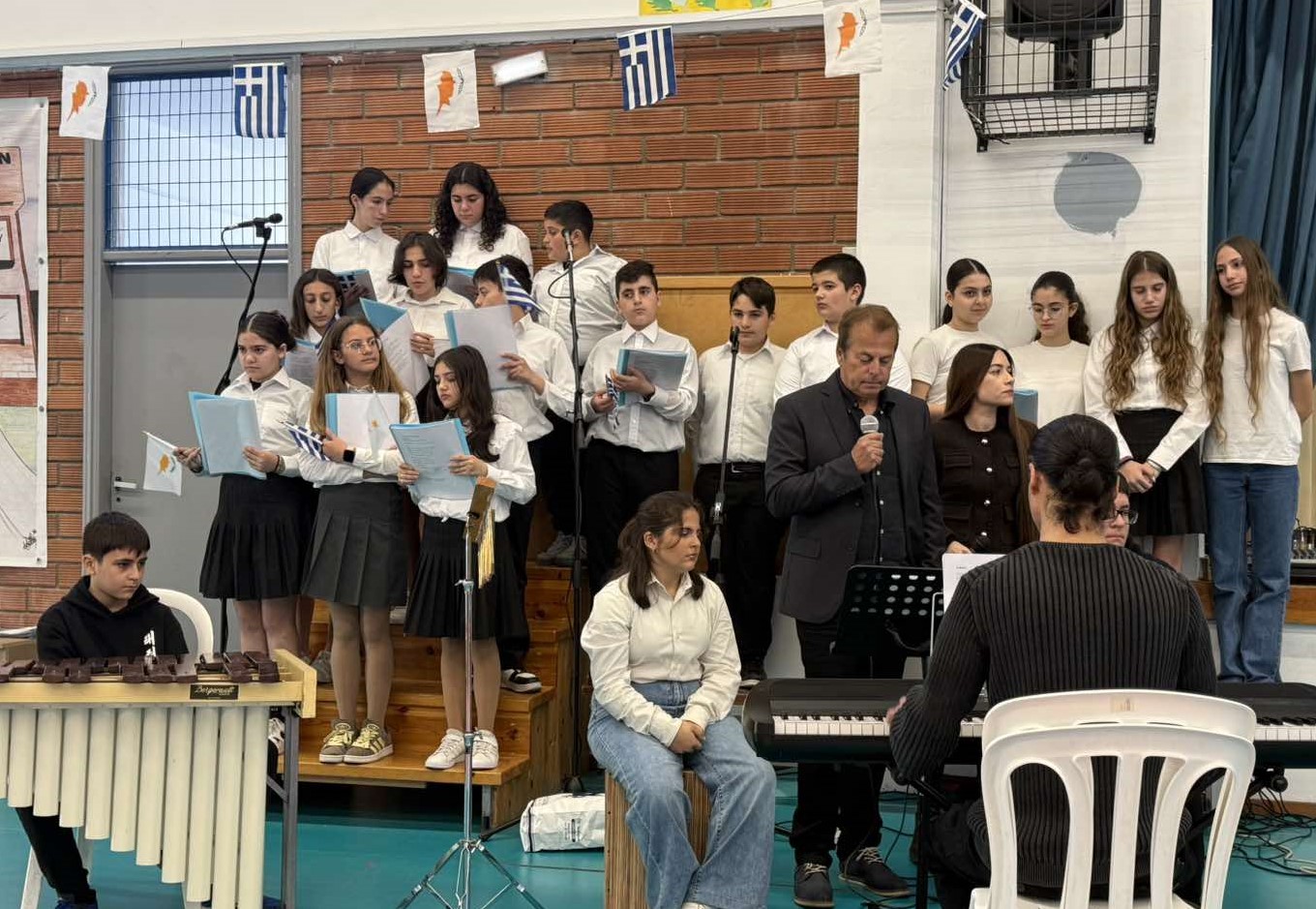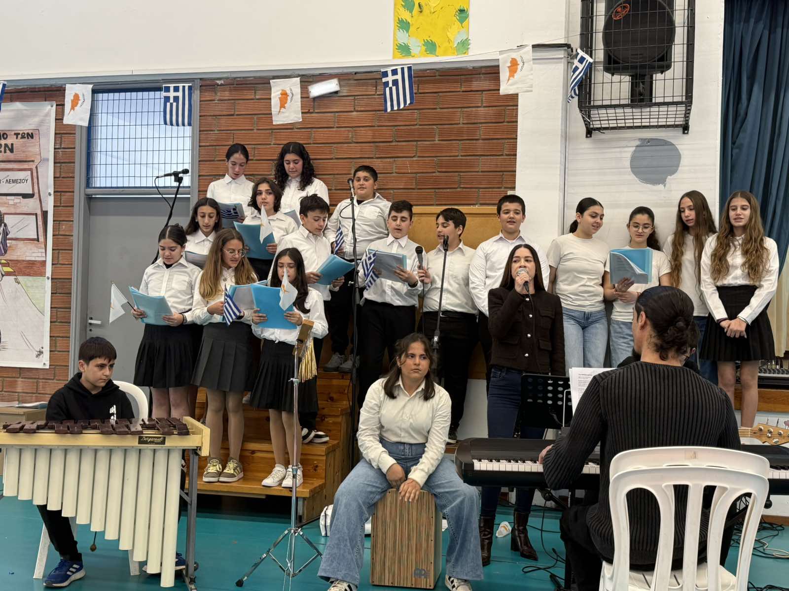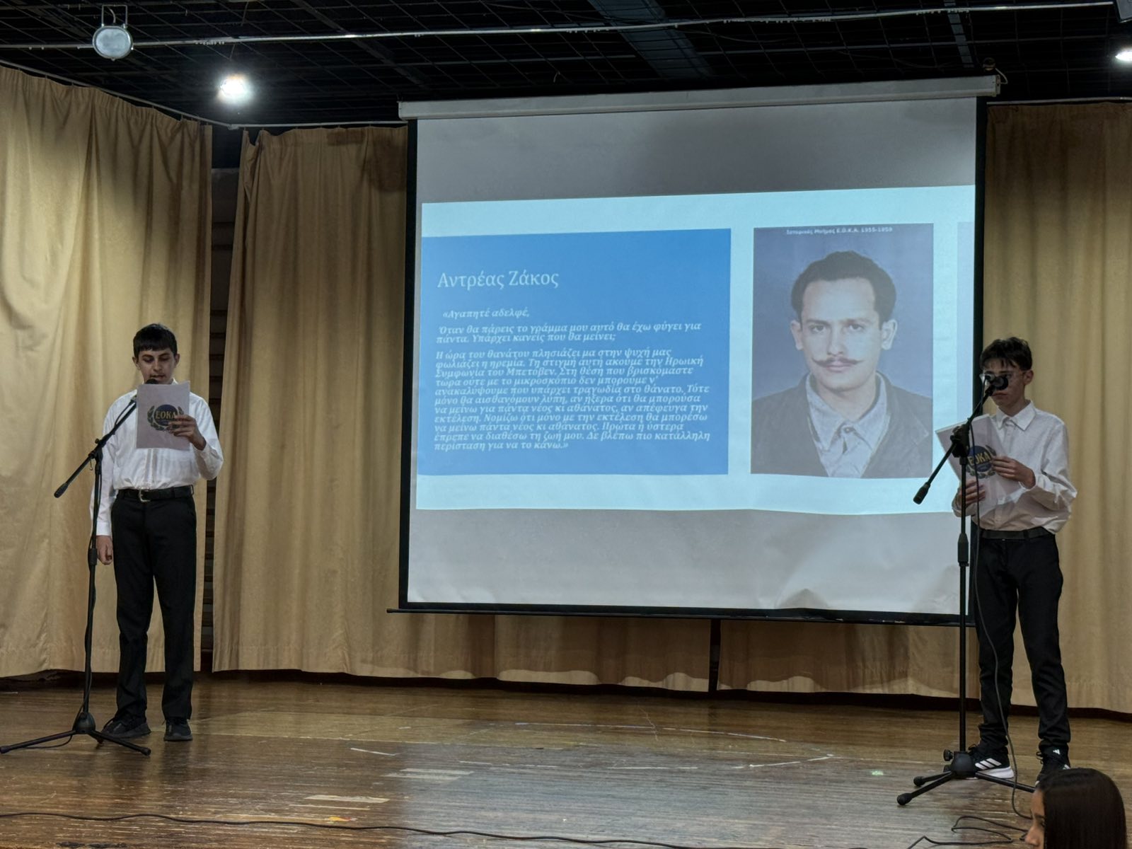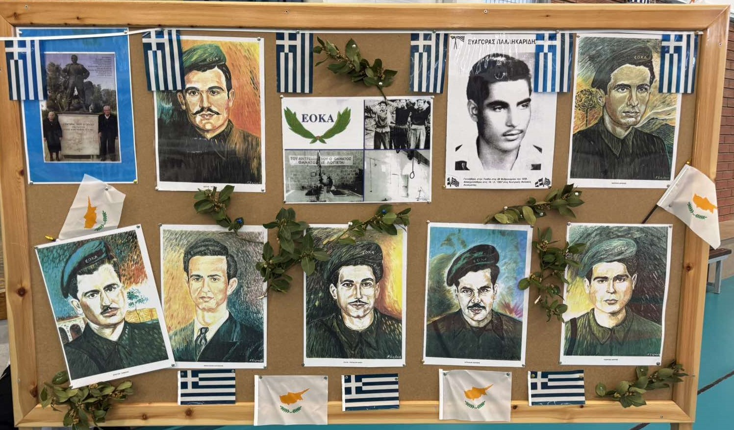 Παραμονή της 1ης Απριλίου εορτάστηκε στο Σχολείο μας με ιδιαίτερη συγκίνηση η επέτειος του αγώνα της ΕΟΚΑ 1955-59 για την αποτίναξη του αγγλικού ζυγού. Την εκδήλωση επιμελήθηκαν οι φιλόλογοι κ. Αθηνά Ορφανίδου και η κ. Λουκία Ντάσιν Παπαγεωργίου. Το μήνυμα της Υπουργού Παιδείας ανέγνωσε η Β.Δ. κ. Άννα Μιχαήλ. Η εκδήλωση περιλάμβανε απαγγελίες, προβολές οπτικοακουστικού υλικού, χορούς και τραγούδια. Τα τραγούδια δίδαξε ο καθηγητής μουσικής κ. Αλέξανδρος Πέτρου και τους χορούς ο καθηγητής Φυσικής Αγωγής κ. Χάρης Αντωνιάδης. Στα τραγούδια συνόδευσαν τους μαθητές και τις μαθήτριες η κ. Χαρά Γιωρκάτζη και ο κ. Κύπρος Βαλανός.