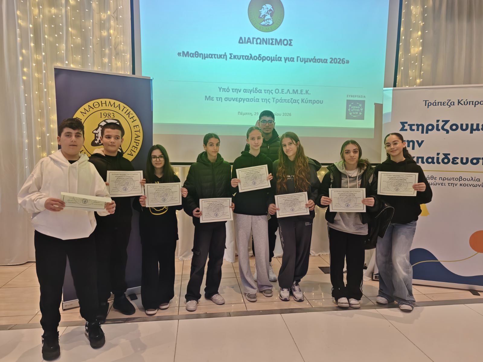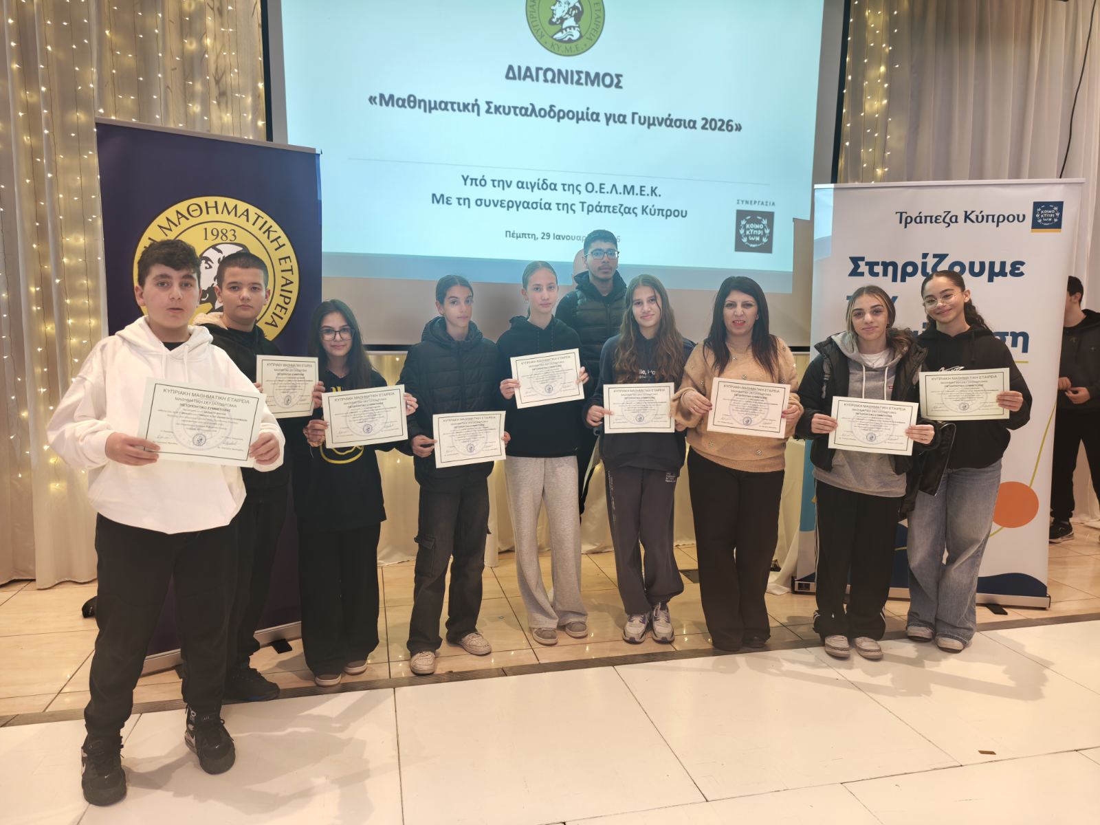 Με μεγάλη επιτυχία ολοκληρώθηκε ο Διαγωνισμός της "Μαθηματικής Σκυταλοδρομίας 2026" για Γυμνάσια, που διοργάνωσε στις 29 Ιανουαρίου 2026 η Κυπριακή Μαθηματική Εταιρεία, υπό την αιγίδα της ΟΕΛΜΕΚ και τη συνεργασία της Τράπεζας Κύπρου.