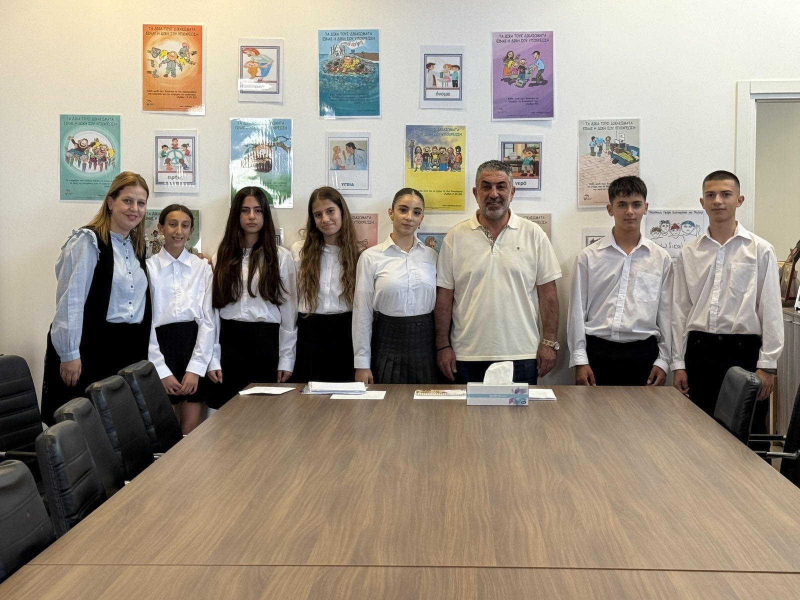 Σήμερα πραγματοποιήθηκε επίσκεψη του Κεντρικού Μαθητικού Συμβουλίου του Σχολείου μας στον Δήμαρχο Πολεμιδιών κ. Άντρο Θεοδώρου, η οποία αποτέλεσε μια ξεχωριστή εμπειρία για τα παιδιά. Με σεβασμό, ευγένεια και ωριμότητα, οι μαθητές και οι μαθήτριες μας συμμετείχαν ενεργά στη συζήτηση εκφράζοντας τις απόψεις τους με υπευθυνότητα. Η επίσκεψη με αφορμή την Ημέρα προστασίας των δικαιωμάτων του παιδιού επιβεβαιώνει τον σημαντικό ρόλο της τοπικής αυτοδιοίκησης στην εκπαιδευτική διαδικασία.
