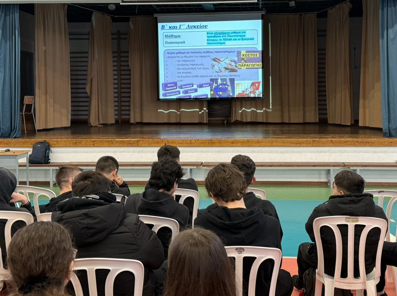 Την Τρίτη 13 Ιανουαρίου οι μαθητές και οι μαθήτριες των Γ’ τάξεων του Σχολείου μας παρακολούθησαν διάλεξη-ενημέρωση για τον Οικονομικό Κλάδο από τον καθηγητή Οικονομικών κ. Μάριο Πογιατζή.